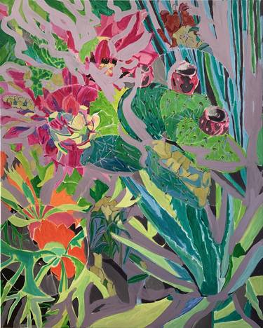 Cavalcade of cacti and petal flowers with shades of green and carmine. Artwork on canvas without frame.
